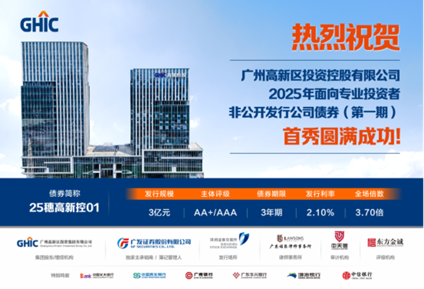 繼取得AA+主體信用評級后,廣州高新區(qū)投資控股有限公司(以下簡稱“高新控股公司”)于2025年9月17日成功獲批15億私募公司債券,審核周期僅71天,并于2025年10月20日面向?qū)I(yè)投資者非公開發(fā)行公司債券(第一期)成功完成簿記發(fā)行。首期債券發(fā)行規(guī)模3億元,期限3年,票面利率低至2.10%,全場認(rèn)購倍數(shù)達(dá)3.7倍,較1年期LPR下浮90BP!簿記當(dāng)日市場反映熱烈,參與機(jī)構(gòu)類型多元,涵蓋保險(xiǎn)、銀行、證券、信托等,累計(jì)認(rèn)購資金超10億元。