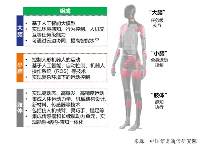 “肢體”負責實現(xiàn)高動態(tài)、高爆發(fā)、高精度運動,包括仿人機械臂、靈巧手、腿足等關鍵結構,并通過集成傳感器和長續(xù)航動力單元。人形機器人具有高度仿人的外形結構、強大的環(huán)境感知能力以及智能決策與學習能力等特征。