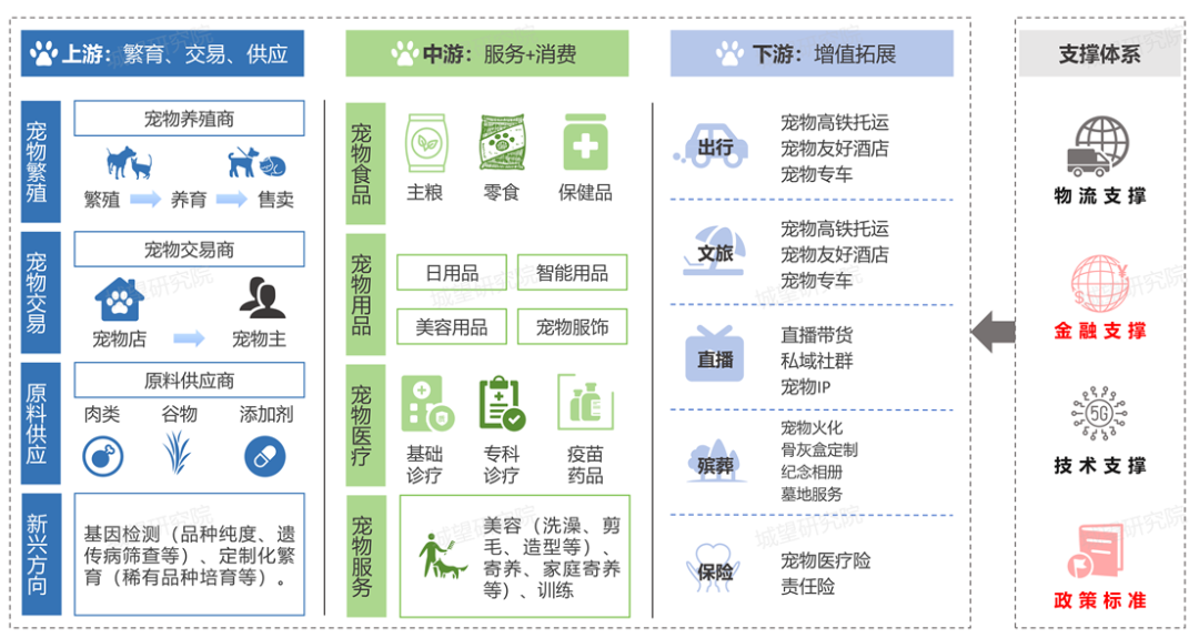 寵物經(jīng)濟產(chǎn)業(yè)鏈支撐體系有效支撐全產(chǎn)業(yè)鏈高效協(xié)同,主要包括: