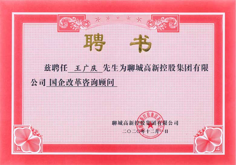 高新控股集團(tuán)特聘請城望集團(tuán)總裁王廣慶為聊城高新控股集團(tuán)有限公司國企改革咨詢顧問