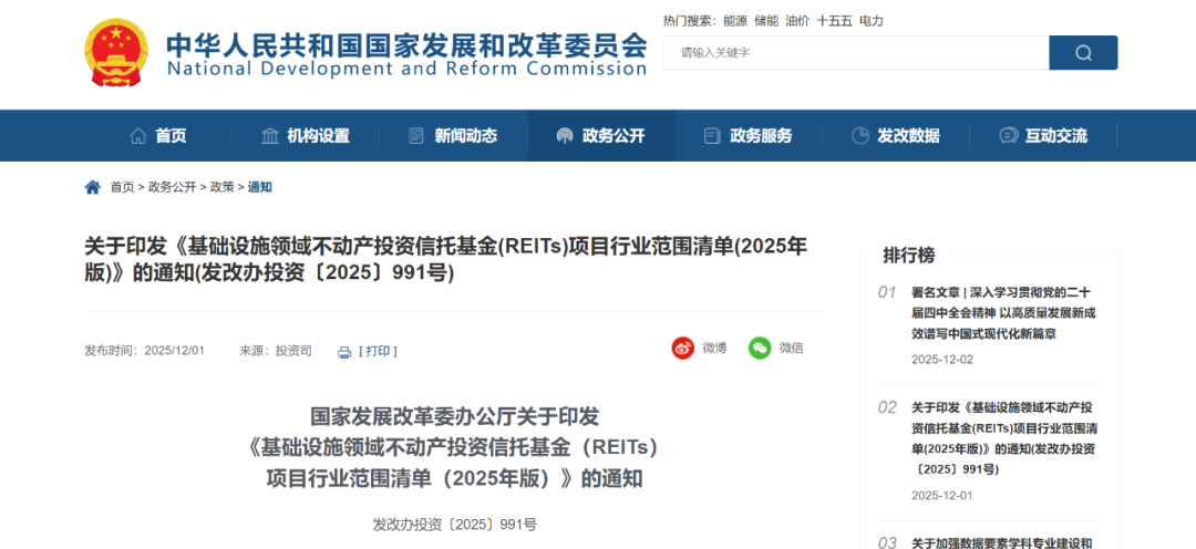 12月1日,國家發(fā)展改革委辦公廳印發(fā)《基礎(chǔ)設施領(lǐng)域不動產(chǎn)投資信托基金(REITs)項目行業(yè)范圍清單(2025年版)》(發(fā)改辦投資〔2025〕991號),基礎(chǔ)設施REITs(即基礎(chǔ)設施領(lǐng)域不動產(chǎn)投資信托基金)進一步擴圍至城市更新設施、酒店、體育場館、商業(yè)辦公設施等更多行業(yè)領(lǐng)域和資產(chǎn)類型。